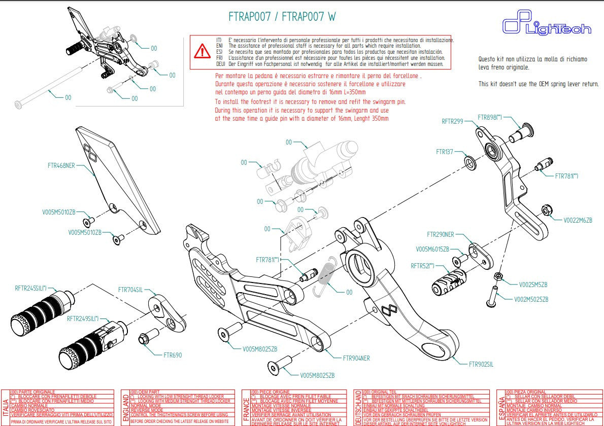 LighTech ayak peg sistemi FTRAP007 (sabit pegler) ve FTRAP007W (katlanabilir pegler), özel olarak Aprilia RS 660 (2020–2026 model yılları) için geliştirilmiştir. En yüksek kaliteyi, maksimum ayarlanabilirliği ve hem yol hem de yarış koşullarında optimal çalışma esnekliğini sunar.