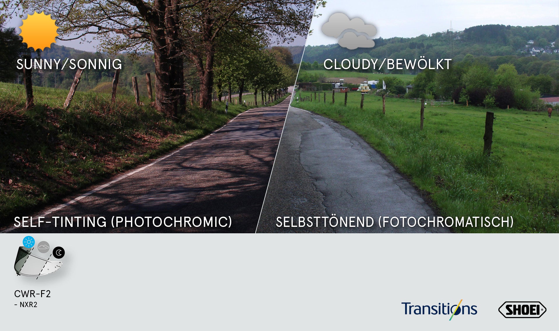 Shoei X-SPR PRO için photochromatic CWR-F2PN vizör ile görüş açın otomatik olarak ışık koşullarına uyum sağlar. Bulutlu, güneşli veya gölgede - adaptif vizör kendiliğinden açık renkten koyu renge geçiş yapar. İkinci bir vizöre ve değişime ihtiyacınız yoktur - turcu sürücüler, pist günü meraklıları ve çok yönlü sürücüler için idealdir.